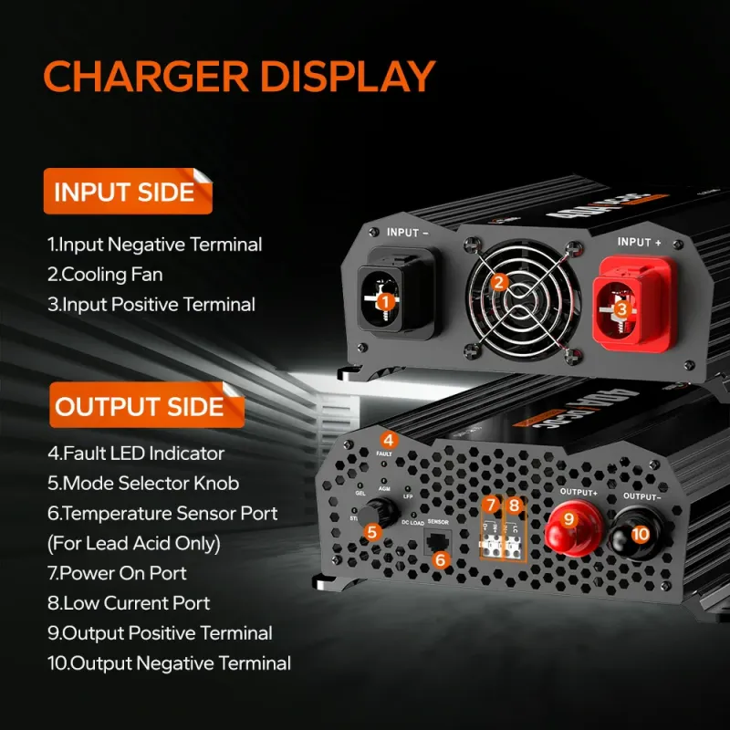 - Multi-Stage Smart Charging: 2-step (CC/CV) for LiFePO4 or 3-stage (Bulk/Absorption/Float) for lead-acid, with knob to select battery type.
