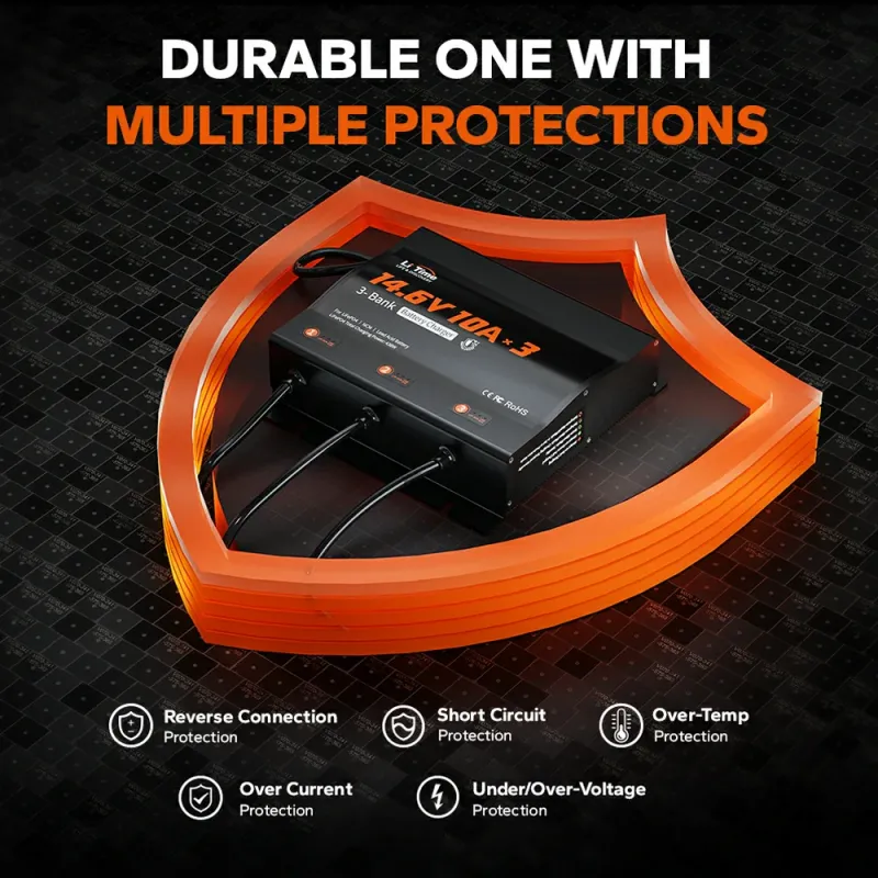 Elevate your battery maintenance with the LiTime 3 Bank 12V 10A waterproof LiFePO4 charger, a compact, high-performance multi-bank charger designed for safe and efficient simultaneous charging of three 12V LiFePO4, NCM, or lead-acid batteries in RVs, trolling motors, boats, camping gear, off-grid cabins, and home storage setups. Featuring a 3-stage charging process (pre-charge, constant current, and constant voltage) with 14.6V DC output and 10A current per bank, it fully charges a 12V 50Ah battery in just 5 hours while activating BMS-protected lithium batteries in 3 seconds. Equipped with LED indicators for standby, charging, full charge, and error status, plus a durable aluminum alloy shell with cooling fan, this charger ensures reliable performance with multilevel protections against over-temperature, reverse polarity, short circuit, and over-voltage. Compatible with 100-240V AC input, it includes M8 terminals and 15A fuses for secure connections. Key Features: