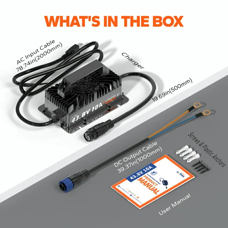 Elevate your battery maintenance with the LiTime 36V (43.8V) 10A IP65 waterproof LiFePO4 charger, a compact, high-performance charger designed for safe and efficient charging of 36V LiFePO4 batteries in golf carts, electric vehicles, RVs, trolling motors, boats, camping gear, off-grid cabins, and home storage setups. Featuring a 3-stage charging process (pre-charge, constant current, and constant voltage) with 43.8V DC output and 10A current, it fully charges a 36V 50Ah battery in just 5 hours while activating BMS-protected lithium batteries in 3 seconds. Equipped with LED indicators for standby, charging, full charge, and error status, plus a durable aluminum alloy shell with cooling fan, this charger ensures reliable performance with multilevel protections against over-temperature, reverse polarity, short circuit, and over-voltage. Compatible with 100-240V AC input, it includes convenient M8 terminals and a 50A Anderson connector for secure connections in wet environments. Key Features: