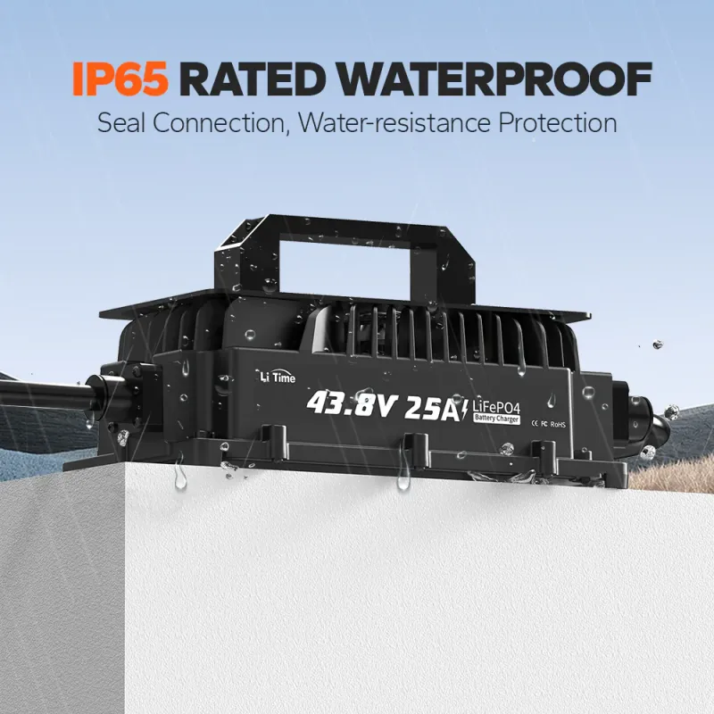 Elevate your battery maintenance with the LiTime 36V (43.8V) 25A IP65 waterproof LiFePO4 charger, a compact, high-performance charger designed for safe and efficient charging of 36V LiFePO4 batteries in golf carts, electric vehicles, RVs, trolling motors, boats, camping gear, off-grid cabins, and home storage setups. Featuring a 3-stage charging process (pre-charge, constant current, and constant voltage) with 43.8V DC output and 25A current, it fully charges a 36V 100Ah battery in just 4 hours while activating BMS-protected lithium batteries in 3 seconds. Equipped with LED indicators for standby, charging, full charge, and error status, plus a durable aluminum alloy shell with cooling fan, this charger ensures reliable performance with multilevel protections against over-temperature, reverse polarity, short circuit, and over-voltage. Compatible with 100-240V AC input, it includes convenient M8 terminals and a 50A Anderson connector for secure connections in wet environments. Key Features: