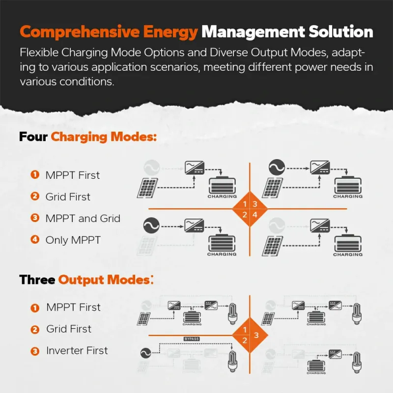 • Adjustable Charging: 40A AC charger with 4 modes (solar only, utility only, solar+utility, utility+solar) for flexibility.