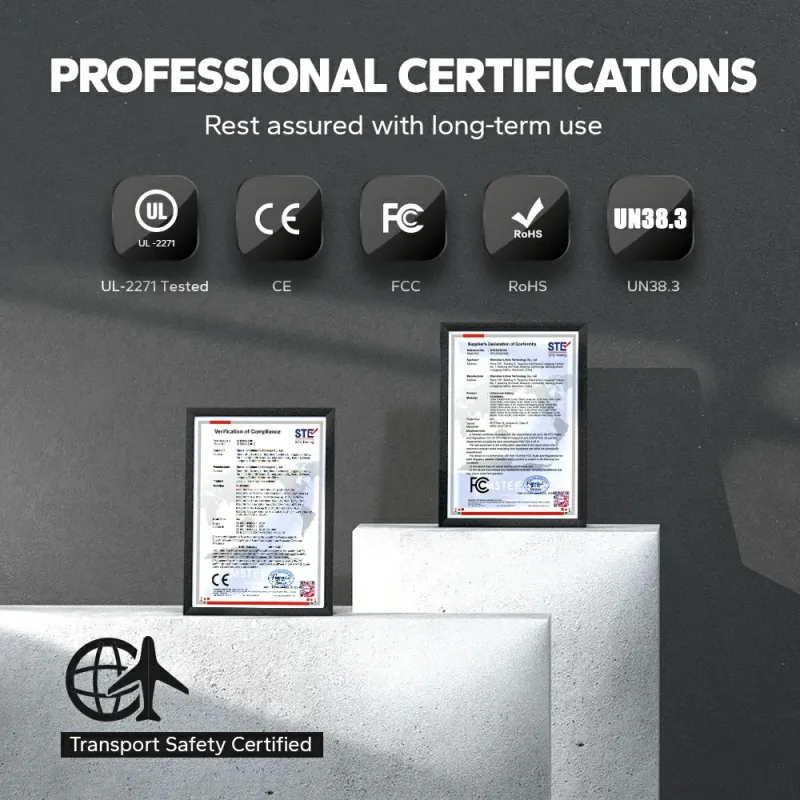 • Safe & Certified: UL-2271, FCC, CE, RoHS, and UN38.3 compliant; EV-grade LiFePO4 cells with patented metal constraint for zero off-gassing, salt-spray resistance, and moisture-proof design.