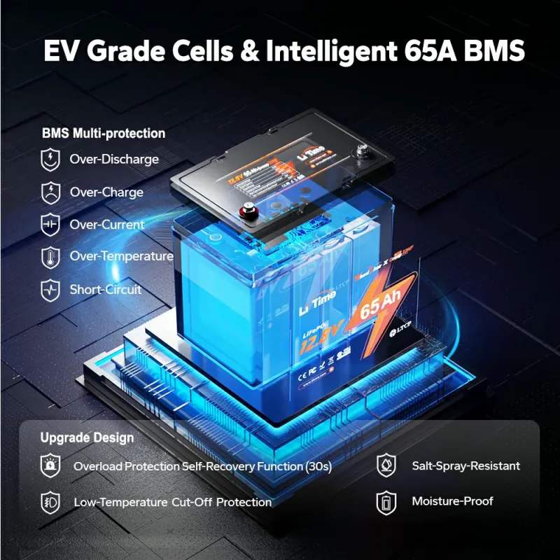 Elevate your mobility and power needs with the LiTime 12V 65Ah 22NF LiFePO4 battery (Model: 12V 65Ah 22NF), a lightweight, high-performance deep cycle battery designed for demanding applications like 30-70lb thrust trolling motors, heavy-duty power wheelchairs (up to 1200W for 8+ hours), mobility scooters, farm equipment, fish finders, camping, and renewable energy setups. Delivering 832Wh of usable energy with a 65A continuous discharge (325A peak for 1s), this battery provides 100% usable capacity, up to 10x longer life than lead-acid, and ultra-fast charging (full in ~1 hour at 1C). Its advanced 65A integrated Battery Management System (BMS) with 20+ protections safeguards against overcharge, over-discharge, short circuits, over-current, low-temp cut-off, and thermal extremes, ensuring safe, efficient performance in rugged environments with an IP65-rated enclosure. Key Features: