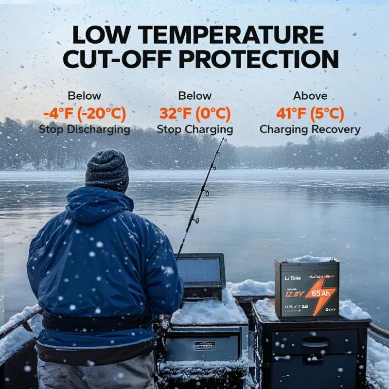 • Low-Temp Protection: Auto discharge cut-off below -4°F (-20°C), charge cut-off below 32°F (0°C), and recovery at 41°F (5°C) for safe operation in cold conditions like ice fishing.