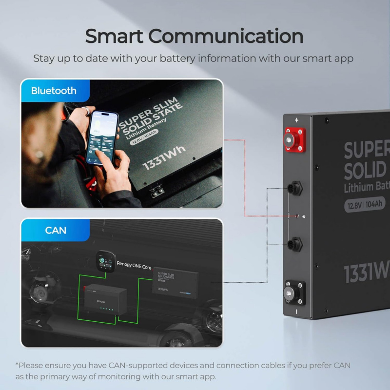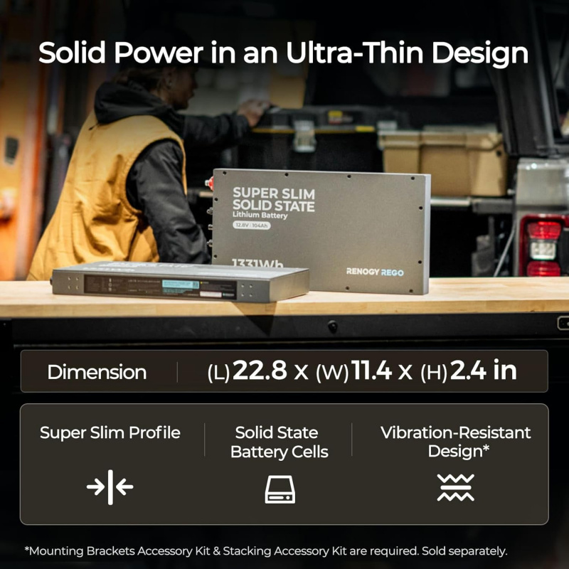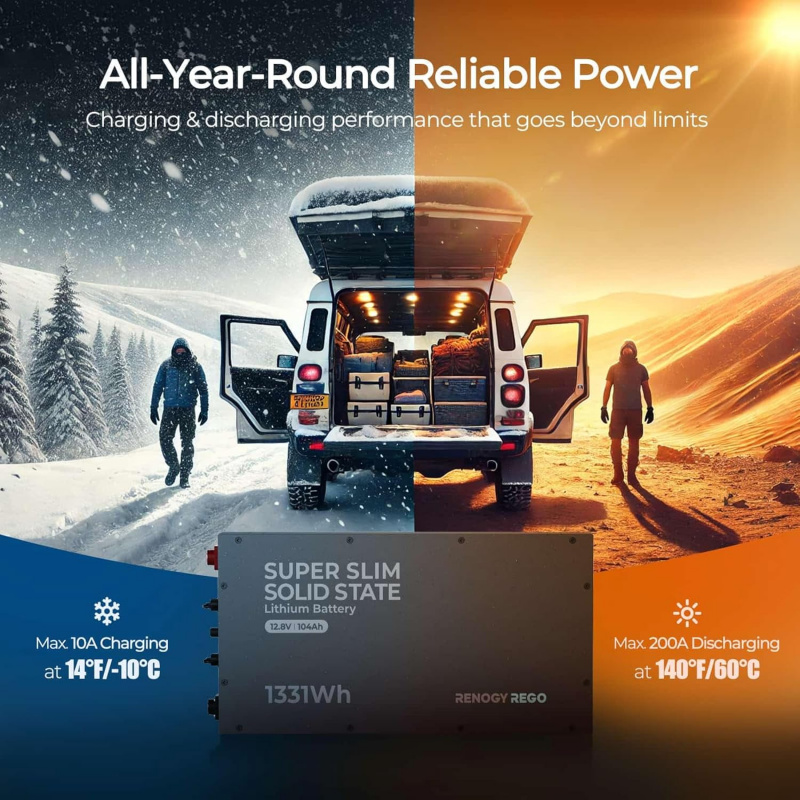 Upgrade your power system with the RENOGY REGO 12V 104Ah Solid State LiFePO4 Battery. Featuring solid-state technology for superior safety, longevity, and performance, this battery is perfect for RVs, marine applications, off-grid solar, and home backup energy storage.
