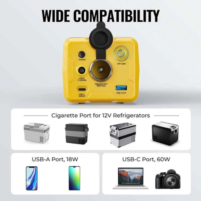 Key Features • 220Wh LiFePO4 Battery – 3000+ cycles to 80% capacity for long-term reliability. • 300W Output – Pure sine wave with 600W surge, safely powers portable fridges, lights, fans, phones, laptops, and small appliances. • Optimized for Fridges – Built-in 12V DC output and low-power efficiency to run 12V/24V fridge/cooler for 10–20+ hours (depending on model/size). • Fast Charging – Full charge in ~2.5 hours via AC or solar input up to 100W (panels sold separately). • Multiple Ports – 2x AC outlets, 2x USB-A (18W), 1x USB-C (100W PD), 1x car port, 2x DC5521 for versatile charging. • Quiet & Safe – <30dB noise level, advanced BMS protections, no emissions. • Ultra-Portable – Only ~9.9 lbs with ergonomic handle for easy carry.