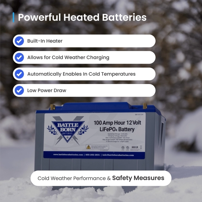 - Built-In Heating System: Automatically activates in sub-freezing temperatures to ensure optimal charging and performance in harsh winter conditions.