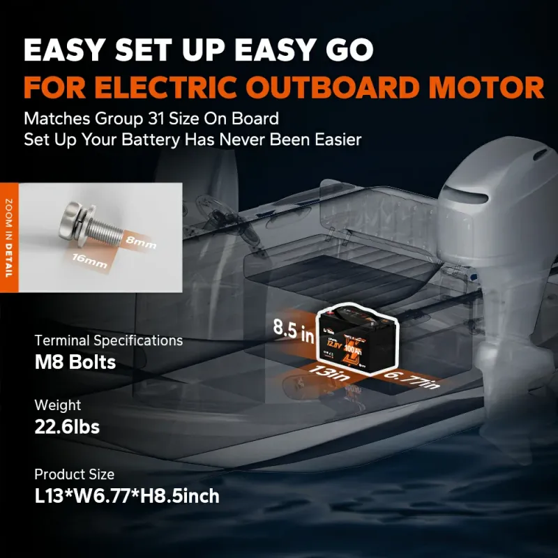 - Lightweight & Efficient: Only 22.6 lbs with 99% round-trip efficiency and <3% monthly self-discharge—66% lighter than lead-acid for improved boat speed and handling.
