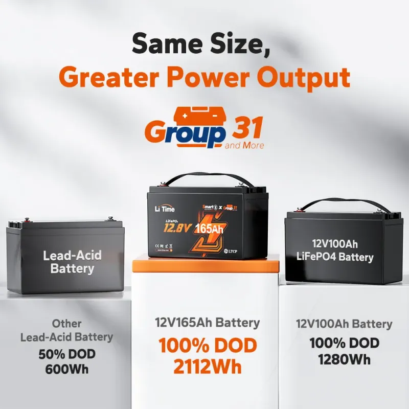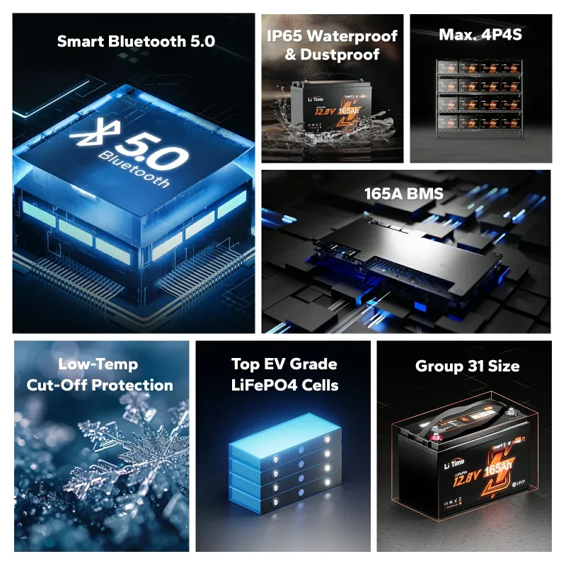 LiTime 12V 165Ah Group 31 LiFePO4 Bluetooth Deep Cycle Lithium Battery – Smart High-Capacity Power Solution for RV, Marine, Solar, and Off-Grid Systems
