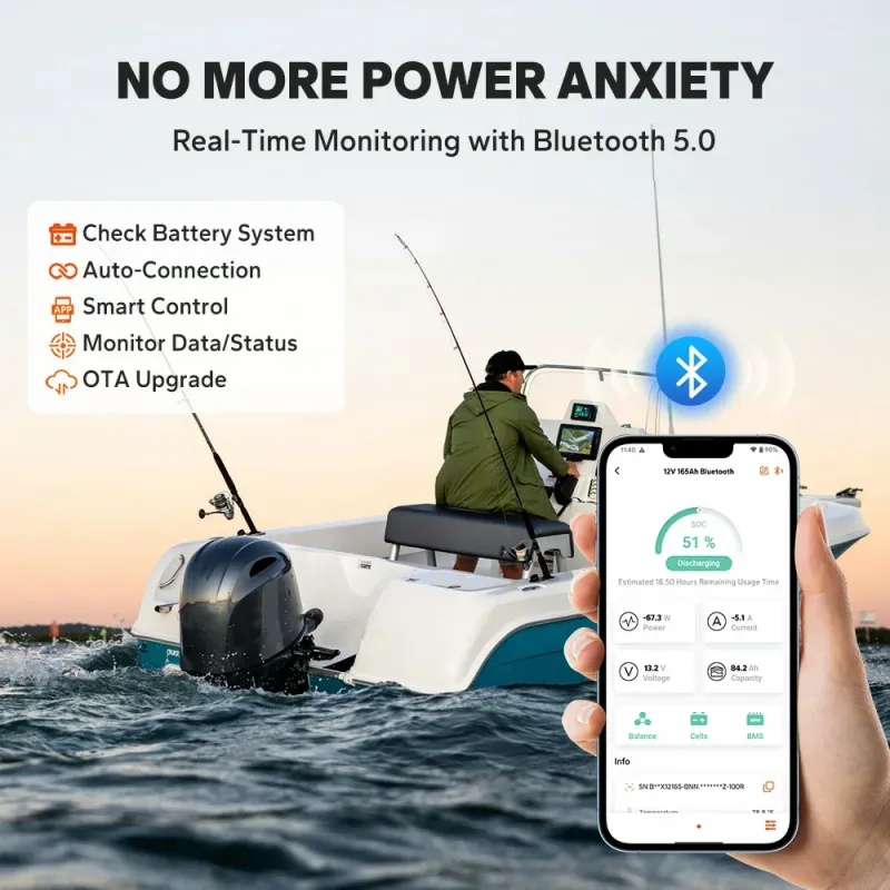 - Smart Bluetooth Monitoring: Bluetooth 5.0 for app-based tracking of SOC, voltage, power, and alerts; Power Reserve Mode auto-cuts off at low power to preserve starting capability.