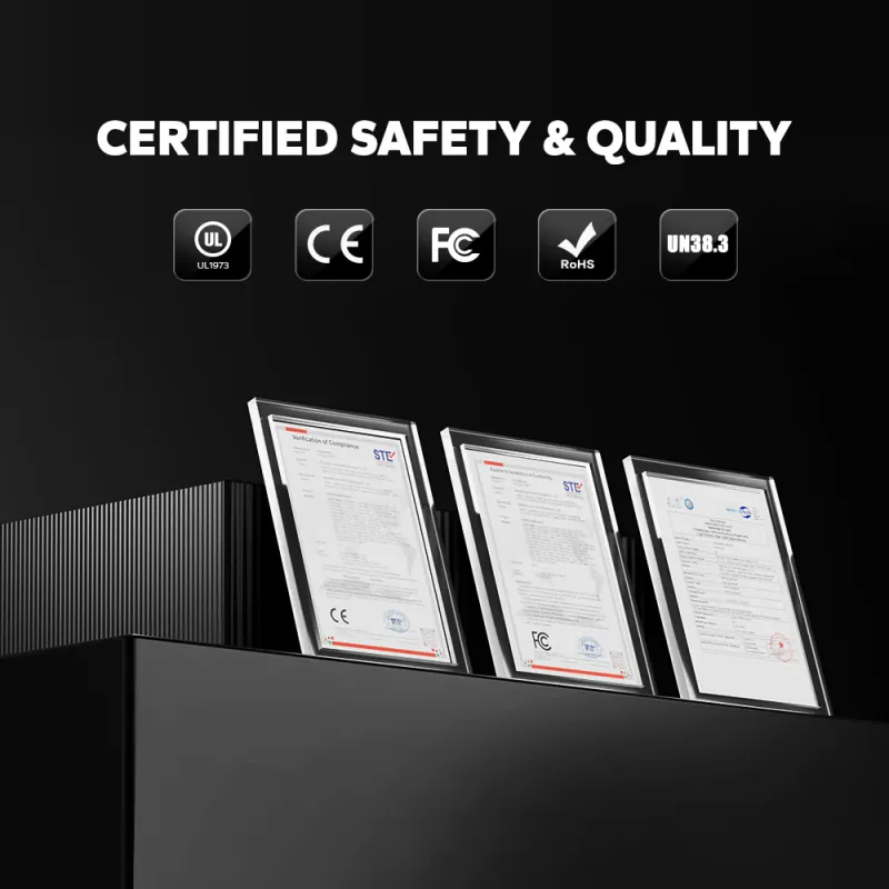 - Safe & Certified: UL-1973, FCC, CE, RoHS, UN38.3, and ABYC E-13 compliant; non-toxic LiFePO4 chemistry with EV-grade cells for eco-friendly, indoor-safe operation.