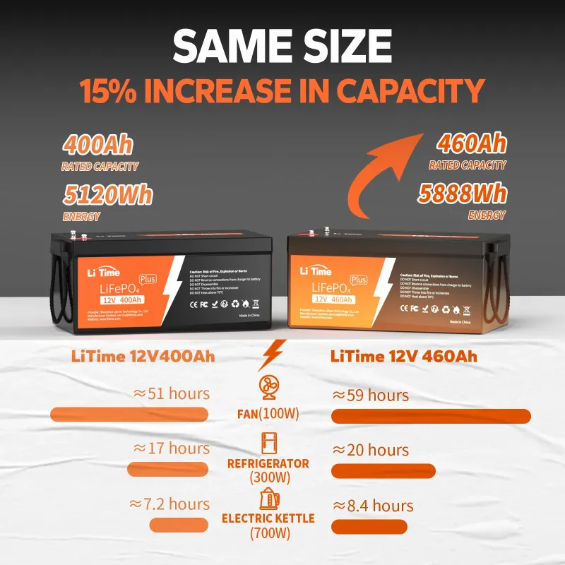 - Voltage: 12.8V; Capacity: 460Ah; Energy: 5888Wh.