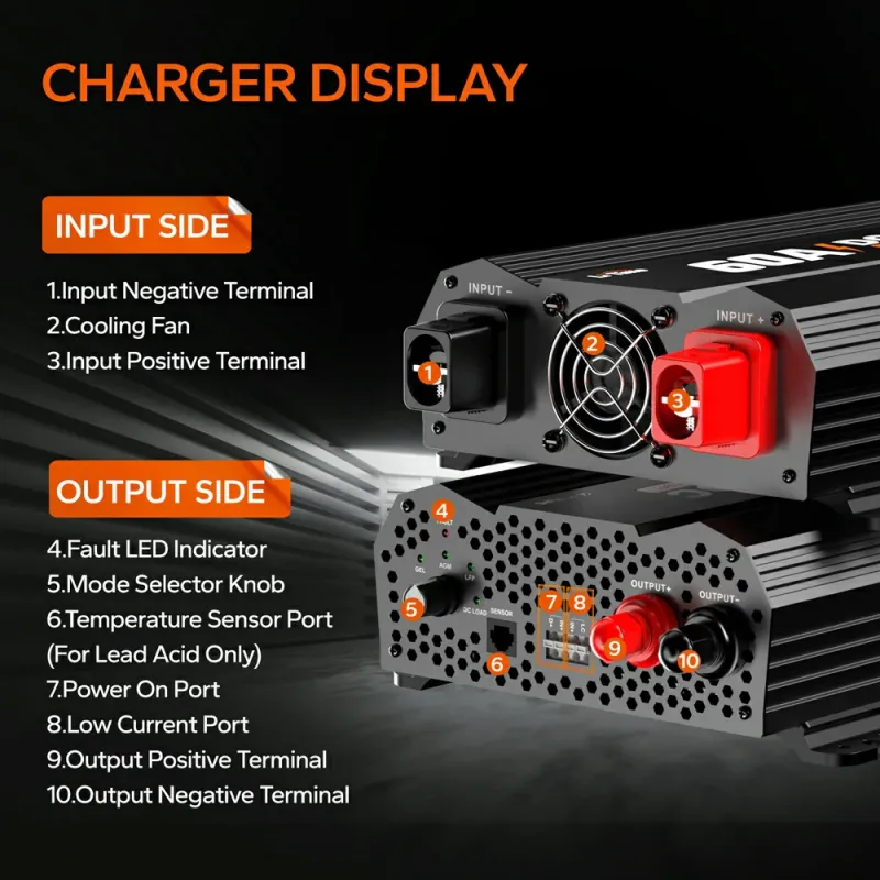 - Multi-Stage Smart Charging: 2-step (CC/CV) for LiFePO4 or 3-stage (Bulk/Absorption/Float) for lead-acid, with knob to select battery type.