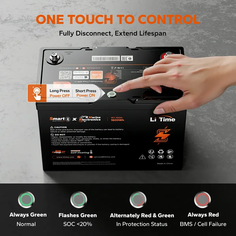 Elevate your fishing adventures in any weather with the LiTime 16V 100Ah LiFePO4 battery (Model: 16V 100Ah), a lightweight, high-performance deep cycle battery with Bluetooth 5.0 for real-time app monitoring and self-heating for safe charging down to -4°F (-20°C). Designed for demanding kayak and marine applications like Humminbird, Lowrance, Garmin, and Raymarine fish finders, sonars, radars, and livescopes, it delivers 1600Wh of energy with a 100A continuous discharge (500A peak for 1s). This battery provides 100% usable capacity, up to 10x longer life than lead-acid, and 25% extended runtime with stronger sonar signals compared to 12V batteries. Its advanced 100A BMS with 20+ protections and low-temp cut-off ensures safe, efficient performance in rugged environments with an IP65-rated enclosure. Key Features: