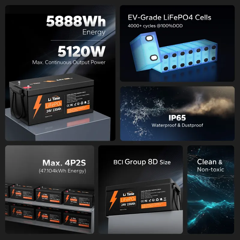 Elevate your energy storage with the LiTime 24V 230Ah LiFePO4 battery (Model: 24V 230Ah), a lightweight, Group 8D-sized deep cycle battery designed for demanding marine, solar, RV, and renewable energy applications. Delivering 5888Wh of energy with a 200A continuous discharge (400A peak for 5s, 800A peak for 1s), this battery provides 100% usable capacity, up to 10x longer life than lead-acid, and fast charging with partial state-of-charge tolerance. Its advanced integrated Battery Management System (BMS) protects against overcharge, over-discharge, short circuits, and thermal extremes, ensuring safe, efficient performance in rugged environments with an IP65-rated enclosure. Key Features: