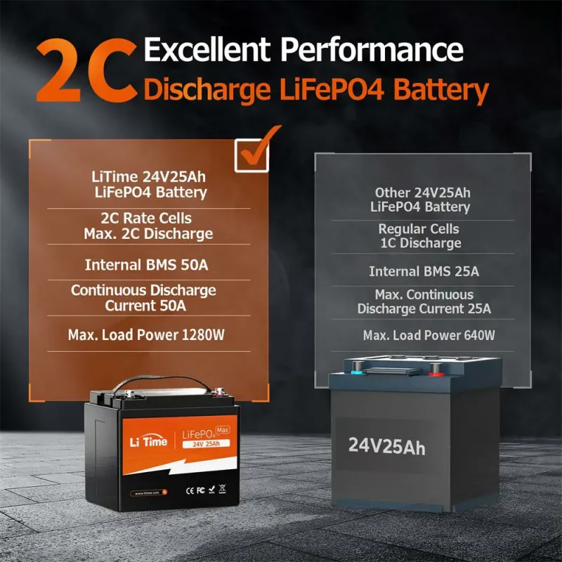 - High-Power Discharge: 2C continuous (50A/1280W) and 5C peak rate, ideal for high-drain devices like mobility scooters and power tools without voltage drop.