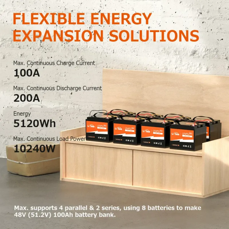- Scalable Design: Supports up to 4 in parallel and 2 in series (4P2S) for expanded 51.2V 100Ah systems (5.12kWh); compatible with major inverters and chargers.