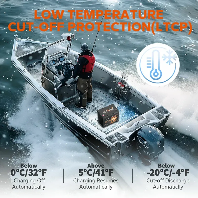 - Low-Temp Protection: Auto charge cut-off below 32°F (0°C) and discharge below -4°F (-20°C), with recovery at 41°F (5°C) for safe cold-weather use like ice fishing.