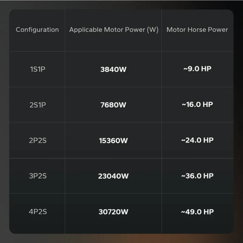 - Voltage: 38.4V nominal; Capacity: 100Ah; Energy: 3840Wh.