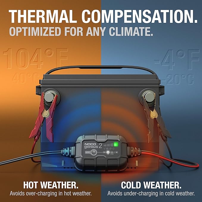 - Temperature Compensation: Integrated sensor adjusts charging for optimal results across -4°F to 104°F climates.