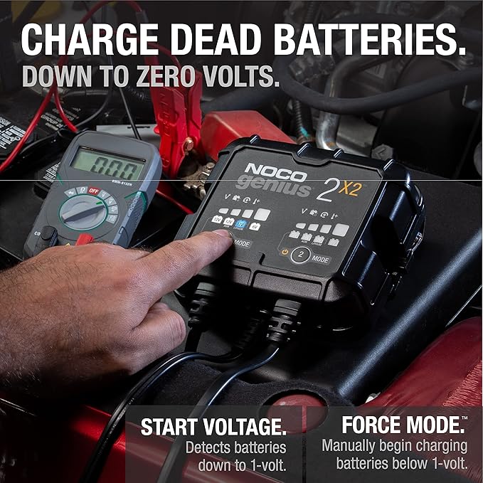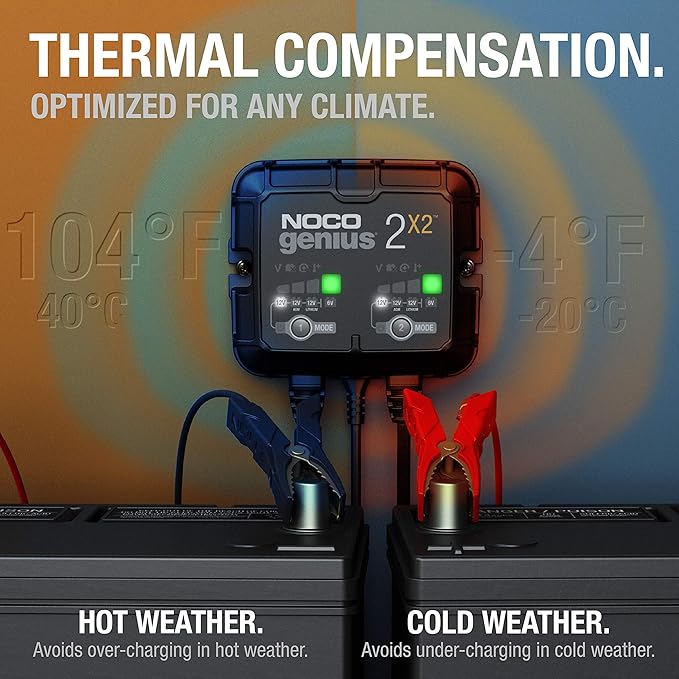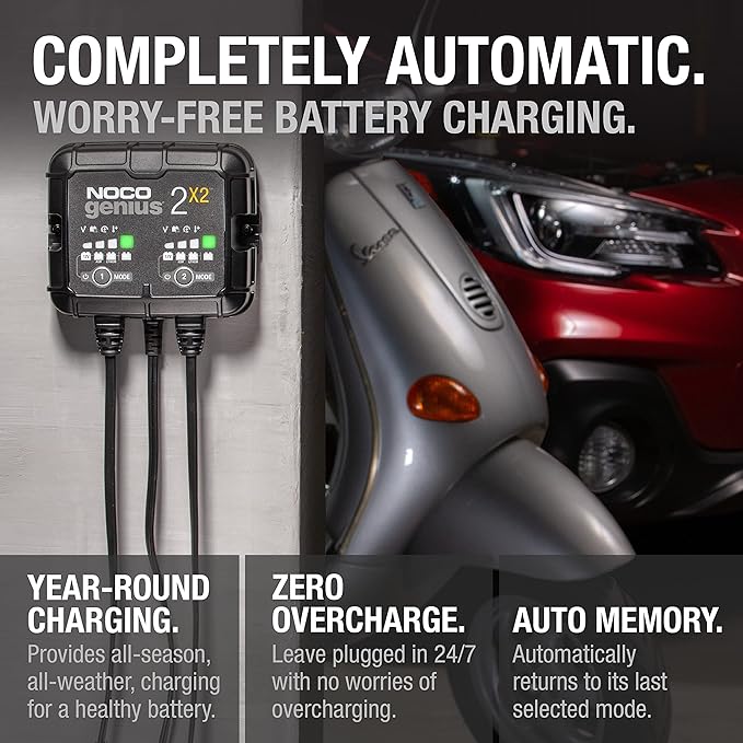 NOCO GENIUS2X2 6V/12V 2-Bank 4A Smart Battery Charger – Dual-Output, Intelligent Maintainer and Desulfator for Automotive, Marine, and Lithium Batteries Double your charging efficiency with the NOCO GENIUS2X2 6V/12V 2-Bank 4A Smart Battery Charger (Model: GENIUS2X2), an innovative dual-bank charger for simultaneous maintenance of two batteries. Ideal for cars, motorcycles, trucks, SUVs, ATVs, boats, RVs, lawn tractors, and powersports, this 4A (2A per bank) smart charger supports lead-acid (flooded, gel, AGM, maintenance-free) and 12V lithium-ion (LiFePO4) batteries up to 40Ah per bank, with modes for charging, maintenance, and desulfation. Its advanced thermal sensor and multi-chemistry profiles ensure safe, precise performance across two batteries at once.