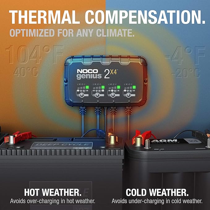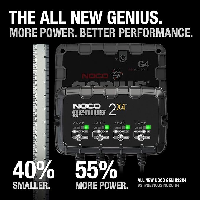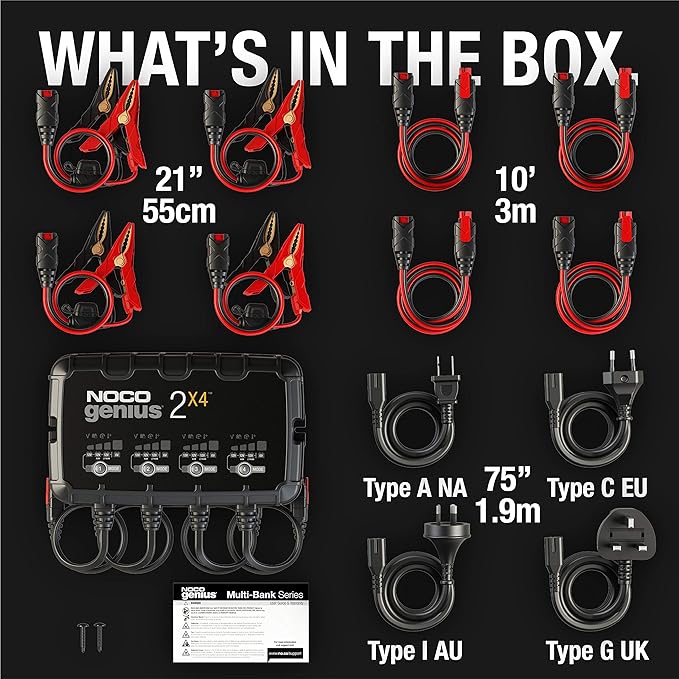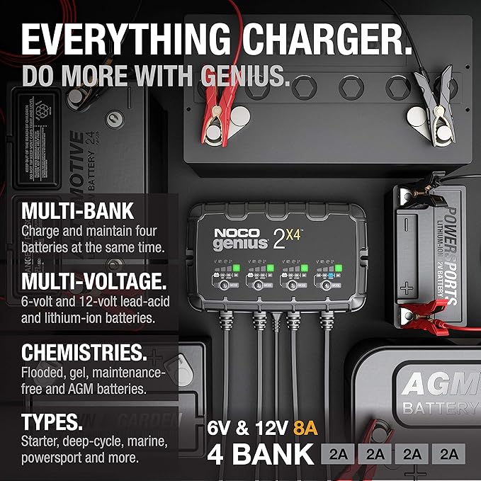 NOCO GENIUS2X4 6V/12V 4-Bank 8A Smart Battery Charger – Quad-Output, Intelligent Maintainer and Desulfator for Automotive, Marine, and Lithium Batteries Multiply your charging capabilities with the NOCO GENIUS2X4 6V/12V 4-Bank 8A Smart Battery Charger (Model: GENIUS2X4), a revolutionary quad-bank charger for simultaneous maintenance of up to four batteries. Perfect for cars, motorcycles, trucks, SUVs, ATVs, boats, RVs, lawn tractors, and powersports, this 8A (2A per bank) smart charger supports lead-acid (flooded, gel, AGM, maintenance-free, calcium, EFB) and 12V lithium-ion (LiFePO4) batteries up to 40Ah per bank, with advanced charging, maintenance, and desulfation modes. Its thermal compensation and multi-chemistry profiles deliver safe, precise performance for multiple batteries at once.
