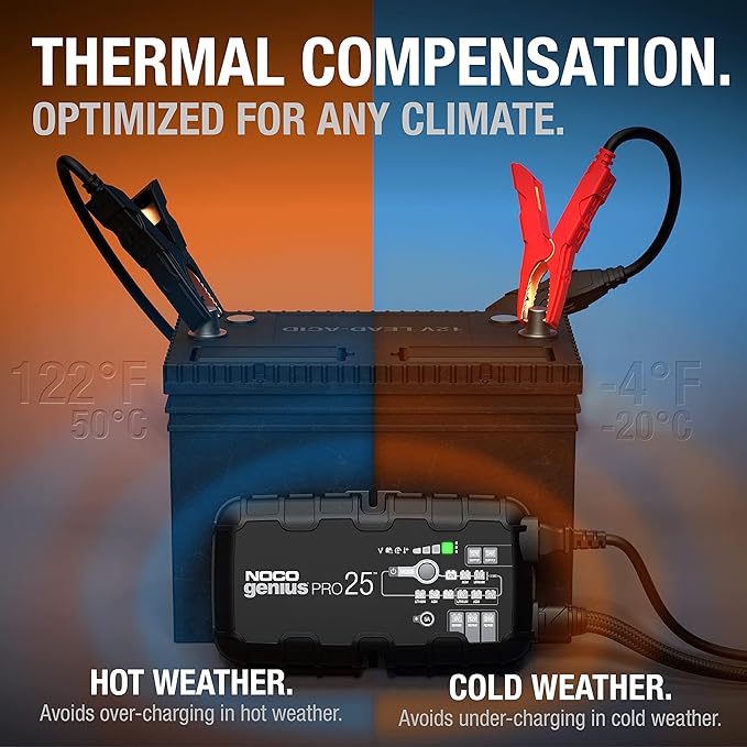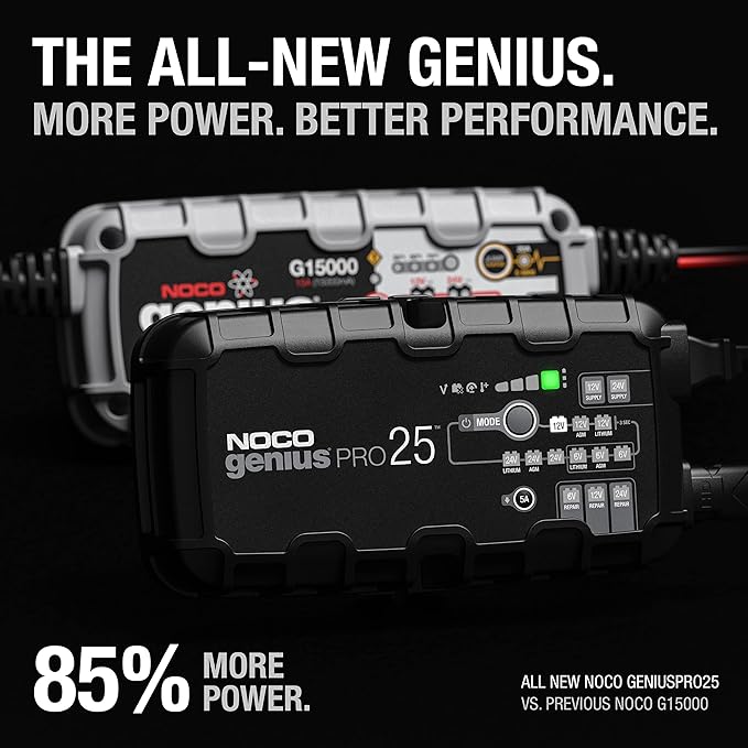 NOCO GENIUSPRO25 6V/12V/24V 25A Smart Battery Charger – Professional-Grade, Multi-Voltage Maintainer, Desulfator, and Power Supply for Automotive, Marine, and Industrial Batteries Unleash professional-level battery management with the NOCO GENIUSPRO25 6V/12V/24V 25A Smart Battery Charger (Model: GENIUSPRO25), a fully-automatic, high-performance charger designed for demanding applications. Ideal for cars, trucks, SUVs, semi-trucks, buses, marine vessels, RVs, deep-cycle setups, industrial equipment, and powersports, this 25A (12.5A at 24V) smart charger supports lead-acid (flooded, gel, AGM, EFB, maintenance-free, calcium) and lithium-ion (LiFePO4 with BMS) batteries up to 1000Ah at 12V, with modes for charging, maintenance, desulfation, repair, and power supply. Its advanced thermal compensation and 17 selectable modes ensure safe, rapid, and precise performance in extreme conditions.