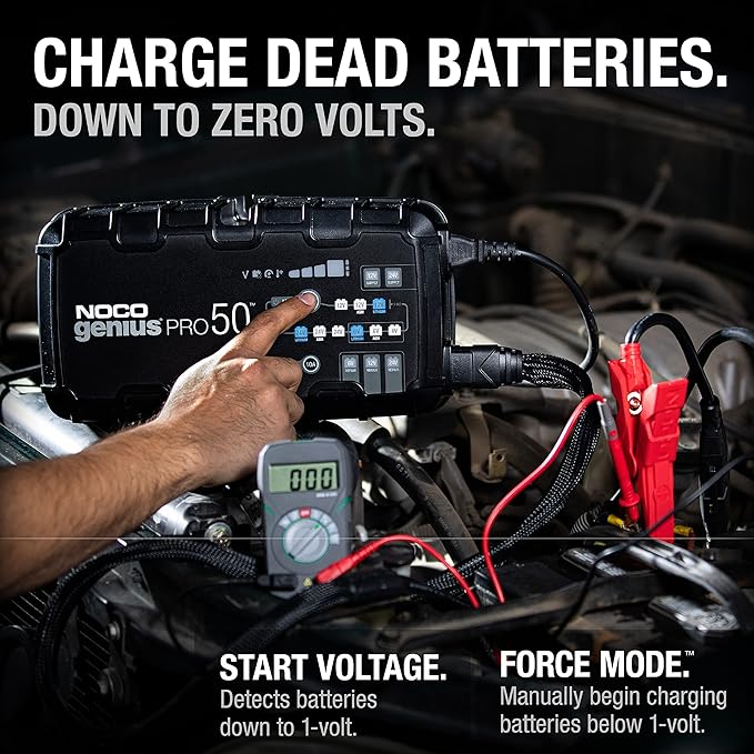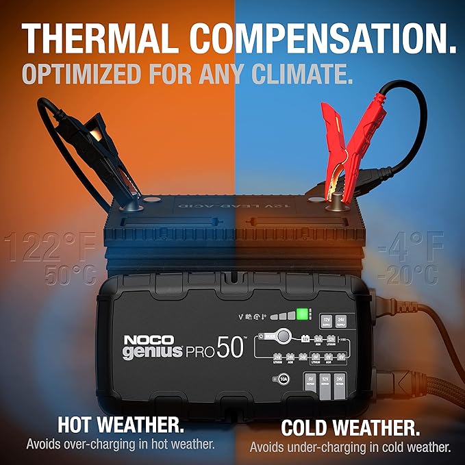 NOCO GENIUSPRO50 6V/12V/24V 50A Smart Battery Charger – Industrial-Grade, Multi-Voltage Maintainer, Desulfator, and Power Supply for Automotive, Marine, and Commercial Batteries Achieve unmatched battery performance with the NOCO GENIUSPRO50 6V/12V/24V 50A Smart Battery Charger (Model: GENIUSPRO50), a fully-automatic, high-capacity charger built for professional and heavy-duty use. Suited for cars, trucks, SUVs, semi-trucks, buses, marine vessels, RVs, deep-cycle systems, industrial equipment, and powersports, this 50A (25A at 24V) smart charger supports lead-acid (flooded, gel, AGM, EFB, maintenance-free, calcium) and lithium-ion (LiFePO4 with BMS) batteries up to 2000Ah at 12V, featuring 17 selectable modes for charging, maintenance, desulfation, repair, and ripple-free power supply. With thermal compensation and cutting-edge diagnostics, it ensures safe, ultra-fast charging in the toughest environments.