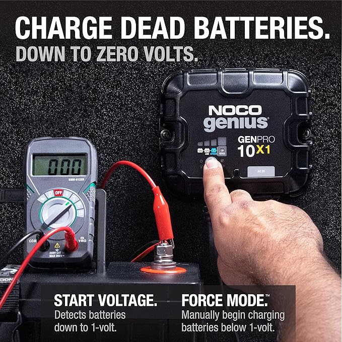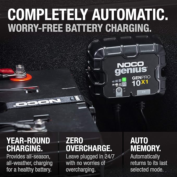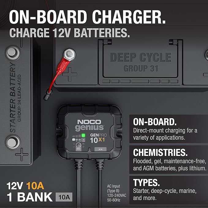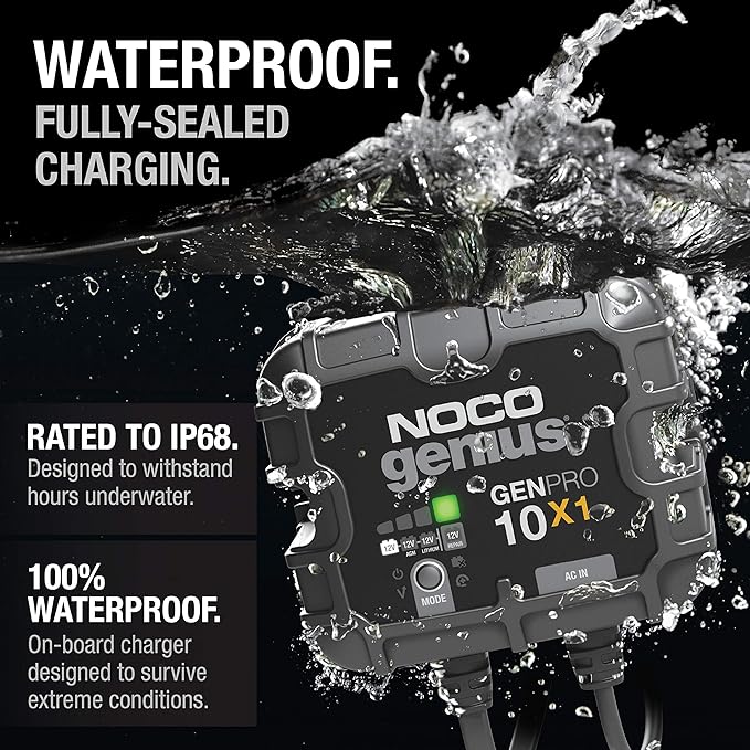 NOCO GENPRO10X1 12V 1-Bank 10A On-Board Battery Charger – Compact, Waterproof Maintainer and Desulfator for Marine, Automotive, and Lithium Batteries Achieve superior onboard battery reliability with the NOCO GENPRO10X1 12V 1-Bank 10A On-Board Battery Charger (Model: GENPRO10X1), a re-engineered, fully sealed charger optimized for extreme marine and vehicle conditions. Ideal for boats, trolling motors, generators, cars, trucks, SUVs, ATVs, RVs, and powersports, this 10A smart charger supports lead-acid (flooded, gel, AGM, maintenance-free, calcium, EFB) and 12V lithium-ion (LiFePO4) batteries up to 230Ah, with modes for charging, maintenance, desulfation, and repair. Its IP68 waterproof rating and thermal compensation ensure safe, efficient performance, even fully submerged or in harsh environments.