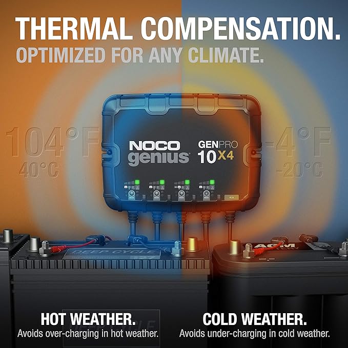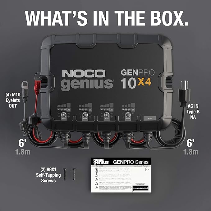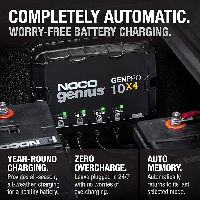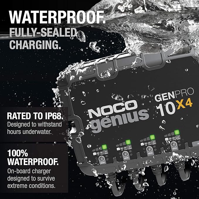 NOCO GENPRO10X4 12V 4-Bank 40A On-Board Battery Charger – Compact, Waterproof Quad Maintainer and Desulfator for Marine, Automotive, and Lithium Batteries Boost onboard battery performance with the NOCO GENPRO10X4 12V 4-Bank 40A On-Board Battery Charger (Model: GENPRO10X4), a re-engineered, fully sealed charger crafted for extreme marine and vehicle conditions. Perfect for boats, trolling motors, generators, cars, trucks, SUVs, ATVs, RVs, and powersports, this 40A (10A per bank) smart charger supports lead-acid (flooded, gel, AGM, maintenance-free, calcium, EFB) and 12V lithium-ion (LiFePO4) batteries up to 230Ah per bank, with modes for charging, maintenance, desulfation, and repair. Its IP68 waterproof rating and thermal compensation ensure safe, efficient operation, even fully submerged or in harsh environments.