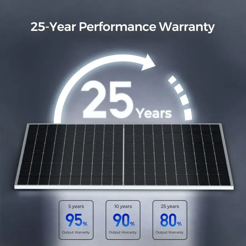 - Exceptional Longevity: 25-year linear power output warranty (≥80% after 25 years); 12-year product warranty; <0.55% annual degradation.