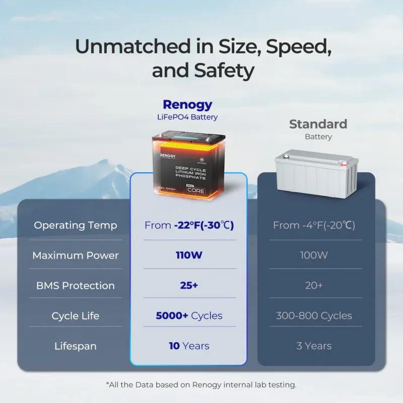 Pair this battery with our premium chargers and inverters for a complete, sustainable power ecosystem. Whether for marine adventures, RV excursions, or solar storage, the Renogy Core Mini DuoHeat Tech 12V 100Ah delivers unmatched efficiency, safety, and peace of mind. Order now and experience Renogy’s innovative lithium excellence—stocked and ready to ship from lithiumion-batteries.com!