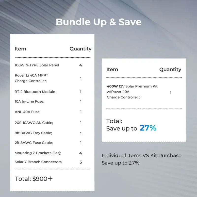 - Complete Kit Contents: Four 100W panels, Rover 40A MPPT controller, BT-2 module, Z-brackets, cables, fuses, and tray cables for plug-and-play installation.