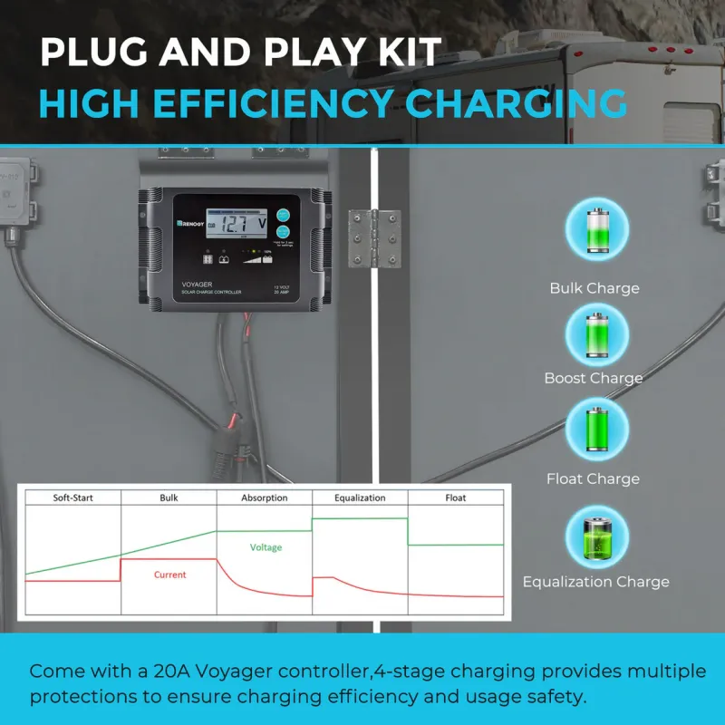 - Integrated Voyager 20A PWM Controller: 3-stage charging algorithm optimizes battery life; LCD screen displays real-time data; supports lead-acid (AGM, gel, flooded) and lithium batteries; overcharge/over-discharge/short-circuit protection.