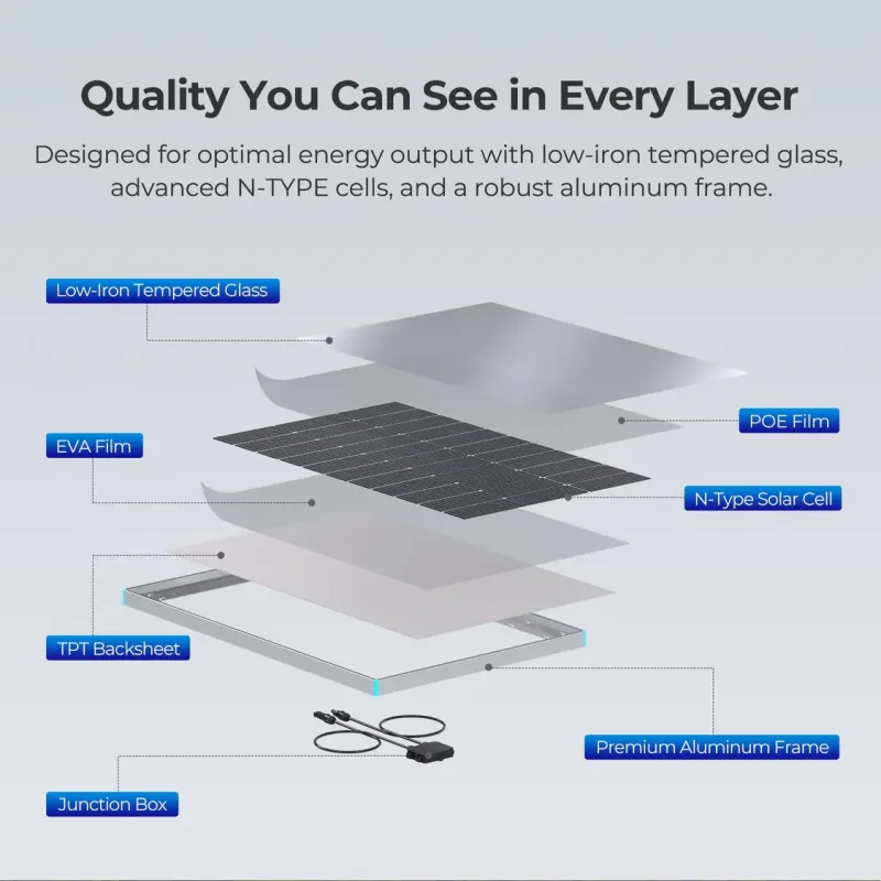 Exceptional Longevity & Efficiency: N-Type technology reduces degradation to <0.55% annually; operates efficiently from -40°F to 185°F (-40°C to 85°C) for all-season performance in hot deserts or cold campsites.