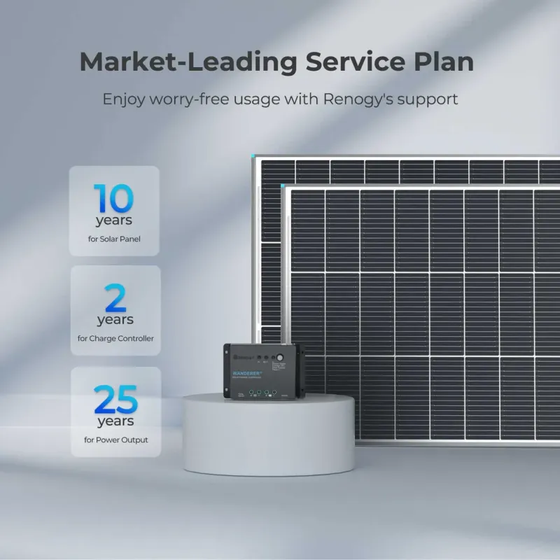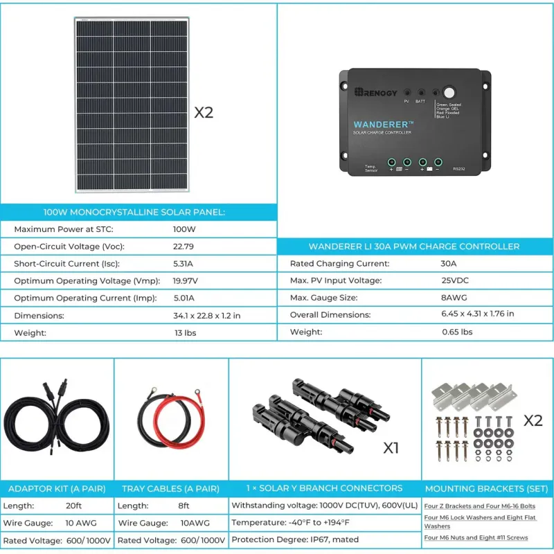 Elevate your entry into solar with the Renogy Starter RV Kit N-Type 200W 12V Solar Kit, an all-in-one, easy-install system tailored for beginners and mobile setups. Featuring two high-efficiency 100W N-Type monocrystalline solar panels (200W total), a smart 30A PWM Wanderer Li charge controller, and plug-and-play accessories like Y-branch connectors and 20ft adaptor cables, this kit charges 12V deep-cycle batteries—compatible with lithium, AGM, gel, or flooded types—delivering sustainable power for lights, pumps, fans, and small electronics without complex wiring. Ideal for RVers, vanlifers, or trailer owners, it generates up to 1000Wh daily in optimal conditions, ensuring reliable off-grid energy with minimal setup while withstanding harsh road and weather challenges. Key Features: