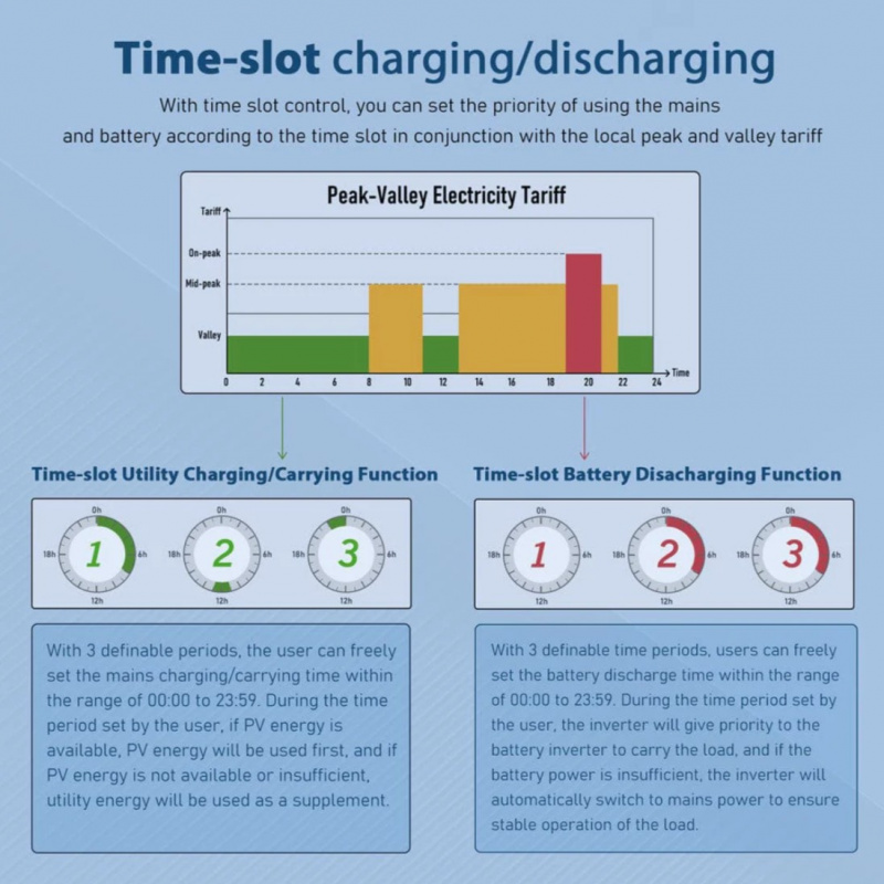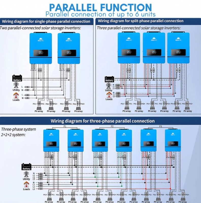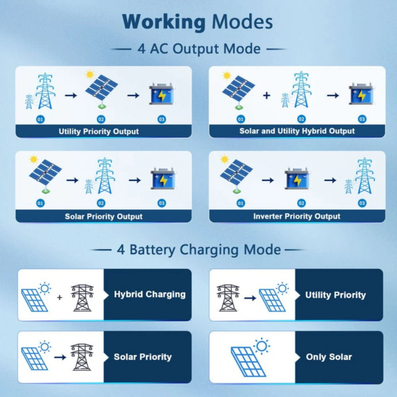 Key Features • 10000W Continuous Output – True 120V/240V split-phase with high surge capability for heavy loads like central AC, well pumps, dryers, and full kitchens. • Hybrid Functionality – Works off-grid, grid-tie, or as a backup system with automatic transfer switch. • 48V Battery Input – Compatible with lithium, AGM, gel, or flooded batteries (LiFePO4 recommended). • High Solar Input – Supports large PV arrays for fast renewable charging (specific max varies by config). • Built-in MPPT Charge Controller – Efficient solar charging directly from panels. • Multiple Protection Layers – Overload, over-temperature, short-circuit, low-battery, and reverse polarity safeguards. • Smart Monitoring – LCD display and optional app/Wi-Fi for remote monitoring. • Durable Design – Rugged construction for indoor/outdoor use with cooling fans.
