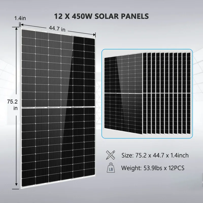 Specifications at a Glance Inverter Voltage: 48VDC input, 120/240V AC output • Continuous Power: 10,000W • Surge Power: 20,000W • MPPT Solar Input: 11,000W max (120–500V) • Battery: 51.2V 100Ah x4 (20.48kWh total) • Continuous Discharge: 100A per battery • Max Charge Current: 100A per battery • Solar Panels: 450W monocrystalline x12 • VMP: 34.5V • VOC: 41.2V • Efficiency: 21.5% • Efficiency: >95% overall • Dimensions: Inverter 25.6 × 17.7 × 5.1 in • Batteries 19.3 × 18.9 × 5.5 in each • Panels 67.8 × 44.6 × 1.4 in each • Weight: Inverter 53.5 lbs • Batteries 93 lbs each • Panels 45.1 lbs each • Certifications: UL1741 (inverter), UL61730 (panels), UN38.3 (batteries) • Warranty: 3 years inverter, 10 years batteries, 25 years panels
