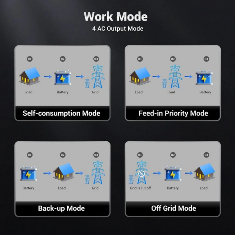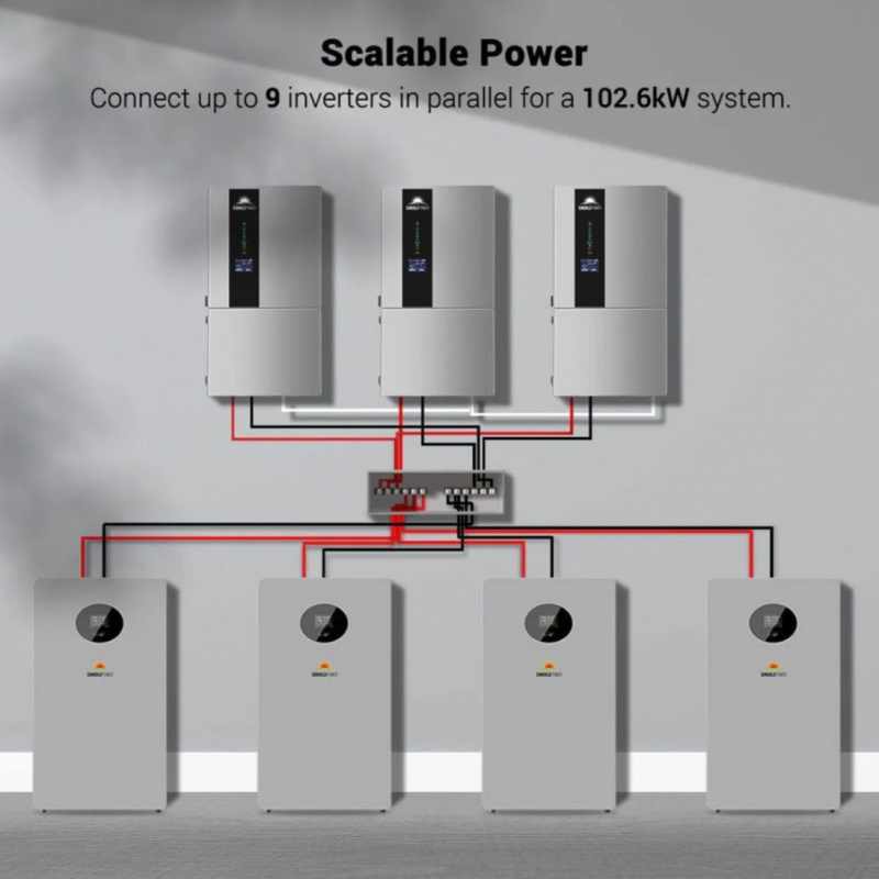 Key Features • 11.4kW Continuous Output – True 120V/240V split-phase with high surge for heavy loads like central AC, well pumps, dryers, and full-home appliances. • 10-Year Warranty – Long-term manufacturer coverage for peace of mind. • Hybrid Functionality – Works off-grid, grid-tie, or as backup with automatic transfer switch. • 48V Battery Input – Compatible with lithium (LiFePO4), AGM, gel, or flooded batteries. • High PV Input – Supports large solar arrays with efficient MPPT charge controllers for maximum renewable harvest. • Built-in Protections – Overload, over-temperature, short-circuit, low-battery, and reverse polarity safeguards. • Advanced Monitoring – LCD display and optional app/Wi-Fi for real-time system status. • Rugged & Reliable – Durable construction for indoor/outdoor use with cooling fans.