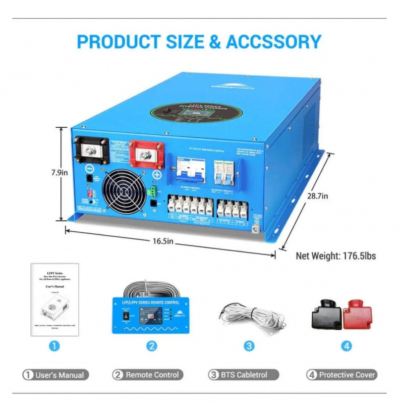 Key Features • 12000W Continuous / 36000W Peak Output – Pure sine wave split-phase 120V/240V with enormous surge for running multiple heavy appliances simultaneously (central AC, well pumps, dryers, welders, full-home loads). • True Split-Phase 120V/240V – Supports dual-voltage output for complete home or large RV power. • Built-in Charger – Efficient AC-to-DC charging for 48V battery banks (lithium, AGM, gel, flooded compatible). • 48V DC Input – Works with 48V lithium (LiFePO4) or lead-acid battery systems. • Multiple Protections – Overload, over-temperature, short-circuit, low-voltage, high-voltage, and reverse polarity safeguards. • Remote Control & Display – LCD screen and optional remote panel for monitoring and control. • Quiet & Efficient – Intelligent cooling fans, low idle consumption, and high efficiency (>90%). • Rugged Design – Durable aluminum housing for indoor/outdoor use with vibration resistance.