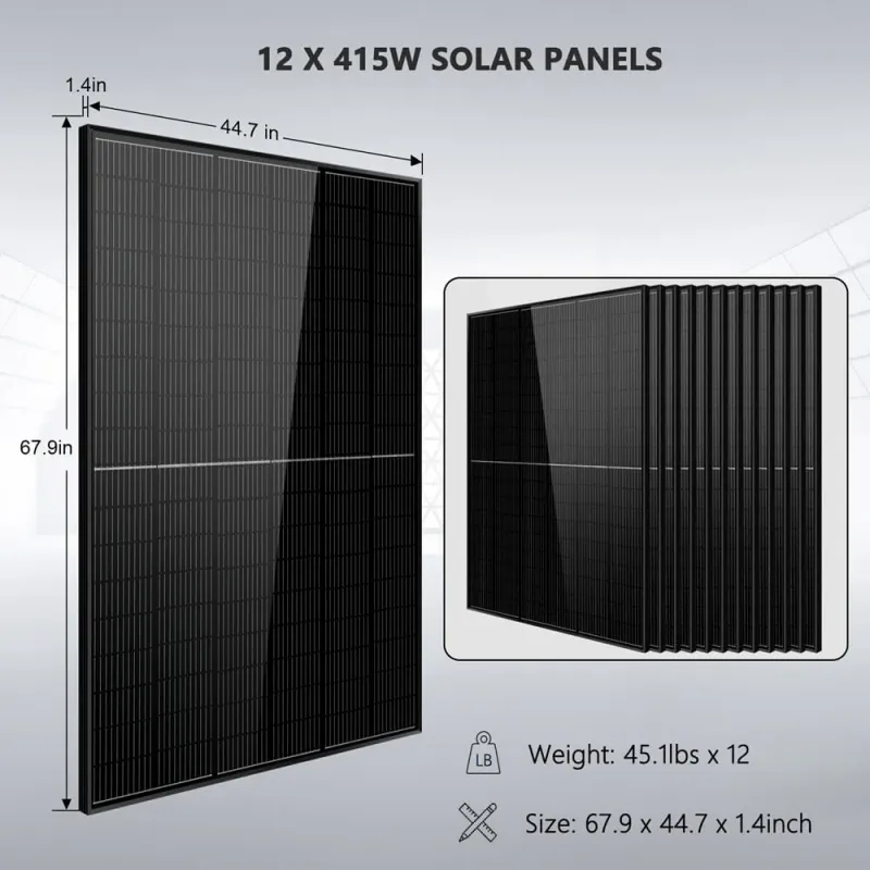 Specifications at a Glance Inverter Power: 12,000W continuous / 36,000W surge Battery Capacity: 25.6kWh (5 × 51.2V 100Ah) Solar Input: 10,000W max Panels: 415W × 12 (Vmp 34.5V, Voc 41.2V) Dimensions (approx): Inverter 27.6 × 16.5 × 8 in | Batteries 19.3 × 18.9 × 5.5 in each | Panels 67.8 × 44.6 × 1.4 in each | Charge Controllers 12.4 × 8.9 × 4.8 in each Weight: Inverter 159.5 lbs | Batteries 93 lbs each | Panels 45.1 lbs each | Charge Controllers 12.5 lbs each Warranty: 3 years inverter | 10 years batteries | 25 years panels (power output)