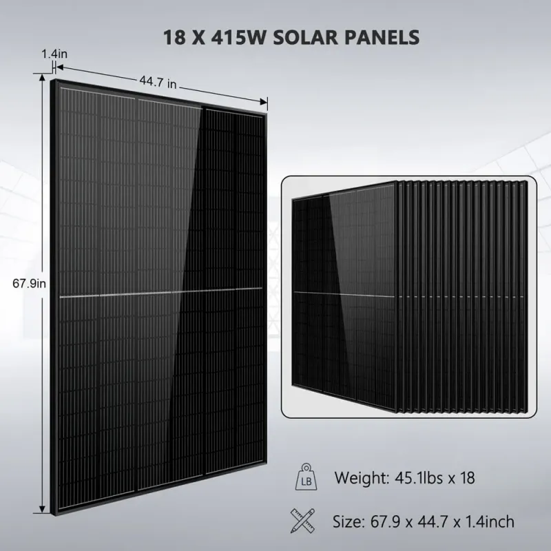 Specifications at a Glance Inverter Voltage: 48VDC input, 120/240V AC output • Continuous Power: 18,000W • Surge Power: 36,000W • MPPT Solar Input: 11,000W max (120–450V) • Battery: 51.2V 100Ah x4 (20.48kWh total) • Continuous Discharge: 100A per battery • Max Charge Current: 100A per battery • Solar Panels: 415W monocrystalline x20 • VMP: 31.61V • VOC: 38.82V • Efficiency: 22.2% • Efficiency: >95% overall • Dimensions: Inverter 25.6 × 17.7 × 5.1 in • Batteries 19.3 × 18.9 × 5.5 in each • Panels 67.8 × 44.6 × 1.4 in each • Weight: Inverter 53.5 lbs • Batteries 93 lbs each • Panels 45.1 lbs each • Certifications: UL1741 (inverter), UL61730 (panels), UN38.3 (batteries) • Warranty: 3 years inverter, 10 years batteries, 25 years panels