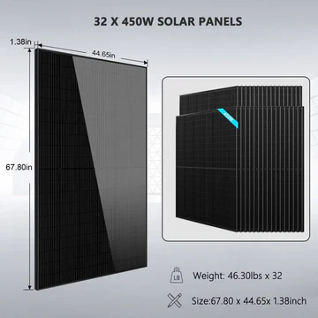Specifications at a Glance Inverter Voltage: 48VDC input, 120/240V AC output • Continuous Power: 20,000W (2x10kW) • Surge Power: 40,000W • Battery: 51.2V 100Ah x6 (30.72kWh total) • Continuous Discharge: 100A per battery • Max Charge Current: 100A per battery • Solar Panels: 450W bifacial N-Type monocrystalline x32 • VMP: 33.57V • VOC: 39.54V • Efficiency: 21.3% • Efficiency: >95% overall • Dimensions: Inverters 25.6 × 17.7 × 5.1 in each • Batteries 19.3 × 18.9 × 5.5 in each • Panels 67.8 × 44.65 × 1.38 in each • Weight: Inverters 53.5 lbs each • Batteries 93 lbs each • Panels 46.3 lbs each • Certifications: UL1741 (inverters), UL61730 (panels), UN38.3 (batteries) • Warranty: 3 years inverters, 10 years batteries, 25 years panels