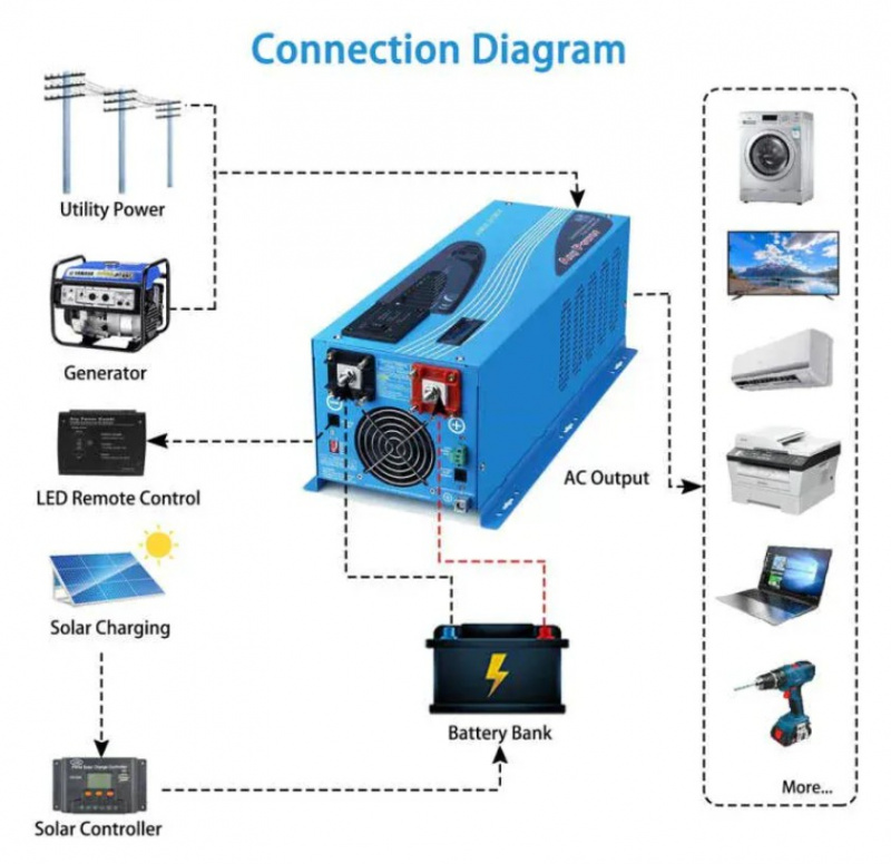 Key Features • 4000W Continuous / 12000W Peak Output – Pure sine wave for clean, stable power suitable for sensitive electronics and high-surge loads. • Built-in Charger – Efficient AC-to-DC charging for 12V battery banks (lithium, AGM, gel, flooded compatible). • 12V DC Input – Works with 12V lithium (LiFePO4) or lead-acid battery systems. • Multiple Protections – Overload, over-temperature, short-circuit, low-voltage, high-voltage, and reverse polarity safeguards. • Remote Control & Display – LCD screen and optional remote panel for monitoring and control. • Quiet & Efficient – Intelligent cooling fans, low idle consumption, and high efficiency (>90%). • Rugged Design – Durable aluminum housing for indoor/outdoor use with vibration resistance.