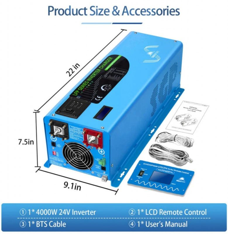Specifications at a Glance Output Power: 4000W continuous / 12000W peak • Input Voltage: 24VDC • Output Voltage: 120V AC pure sine wave • Charger: Integrated AC charger (specific amps per spec sheet) • Efficiency: >90% • Dimensions: ~18.0 × 12.0 × 7.0 in • Weight: ~50 lbs • Operating Temp: Wide range with protections • Warranty: Manufacturer warranty