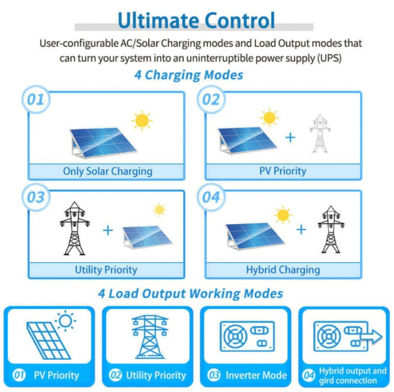 Key Features • 5000W Continuous Output – True 120V/240V split-phase with high surge for heavy loads like central AC, well pumps, dryers, and full-home appliances. • 80A MPPT Charge Controller – Efficient solar charging with up to high PV input voltage for maximum renewable harvest. • 5.12kWh UL1973 & UL9540A Certified LiFePO4 Battery – High safety standards, 6000+ cycles, built-in BMS with multiple protections. • Hybrid Functionality – Works off-grid, grid-tie, or as backup with automatic transfer switch. • 48V Battery Input – Compatible with lithium (LiFePO4), AGM, gel, or flooded batteries. • Built-in Protections – Overload, over-temperature, short-circuit, low-battery, and reverse polarity safeguards. • Advanced Monitoring – LCD display and optional app/Wi-Fi for real-time system status. • Rugged & Reliable – Durable construction for indoor/outdoor use with cooling fans.