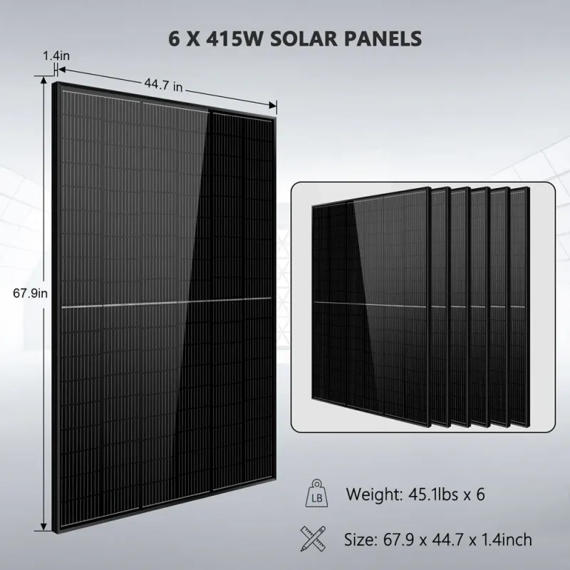 Specifications at a Glance Inverter Voltage: 48VDC input, 120V AC output • Continuous Power: 5000W • Surge Power: 10,000W • MPPT Solar Input: 5500W max (120–450V) • Battery: 51.2V 100Ah x2 (10.24kWh total) • Continuous Discharge: 100A per battery • Max Charge Current: 100A per battery • Solar Panels: 415W monocrystalline x6 • VMP: 31.61V • VOC: 38.82V • Efficiency: 22.2% • Efficiency: >95% overall • Dimensions: Inverter 25.6 × 17.7 × 5.1 in • Batteries 19.3 × 18.9 × 5.5 in each • Panels 67.8 × 44.6 × 1.4 in each • Weight: Inverter 53.5 lbs • Batteries 93 lbs each • Panels 45.1 lbs each • Certifications: UL1741 (inverter), UL61730 (panels), UN38.3 (batteries) • Warranty: 3 years inverter, 10 years batteries, 25 years panels
