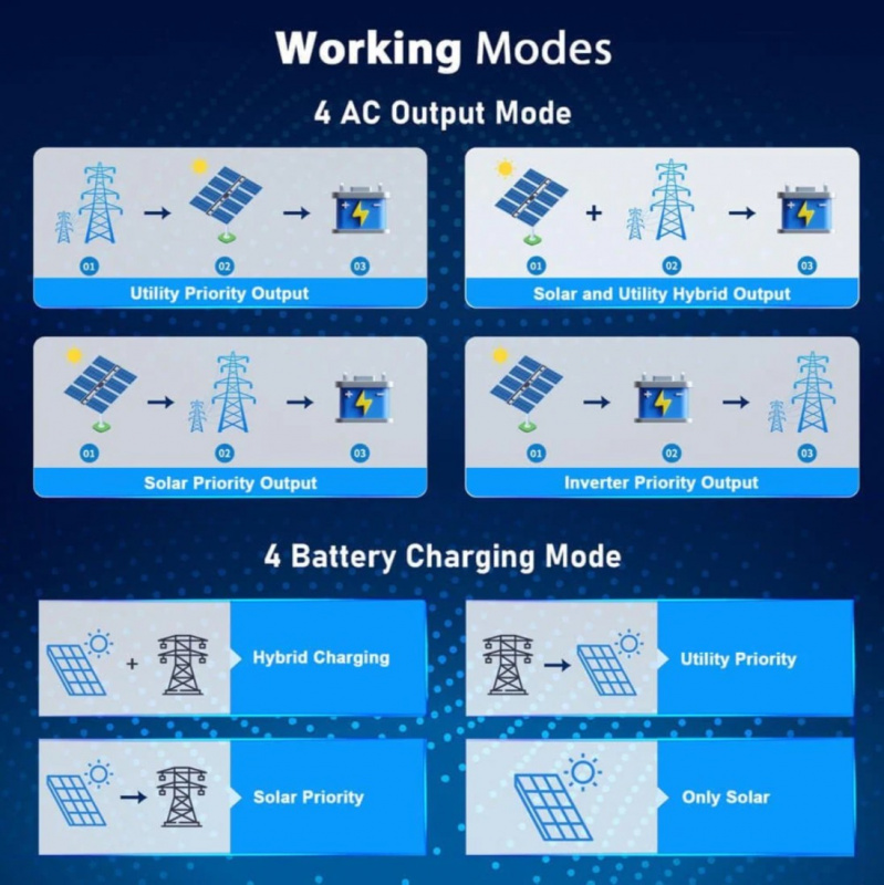 Key Features • 6500W Continuous Output – True 120V/240V split-phase with high surge for heavy loads like central AC, well pumps, dryers, and full-home appliances. • 100A MPPT Charge Controller – Efficient solar charging with up to high PV input voltage for maximum renewable harvest. • 48V 100Ah Lithium Battery – High safety LiFePO4 chemistry, 6000+ cycles, built-in BMS with multiple protections. • Hybrid Functionality – Works off-grid, grid-tie, or as backup with automatic transfer switch. • 48V Battery Input – Compatible with lithium (LiFePO4), AGM, gel, or flooded batteries. • Built-in Protections – Overload, over-temperature, short-circuit, low-battery, and reverse polarity safeguards. • Advanced Monitoring – LCD display and optional app/Wi-Fi for real-time system status. • Rugged & Reliable – Durable construction for indoor/outdoor use with cooling fans.
