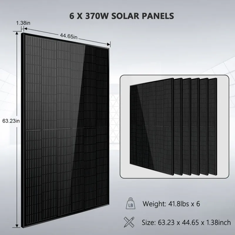 Specifications at a Glance Inverter Voltage: 48VDC input, 120/240V AC output • Continuous Power: 6500W • Surge Power: 13,000W • MPPT Solar Input: 7000W max (120–450V) • Battery: 51.2V 100Ah (5.12kWh) • Continuous Discharge: 100A • Max Charge Current: 100A • Solar Panels: 370W monocrystalline x6 • VMP: 34.5V • VOC: 41.2V • Efficiency: 20.7% • Efficiency: >95% overall • Dimensions: Inverter 25.6 × 17.7 × 5.1 in • Battery 23.6 × 16.5 × 5.9 in • Panels 67.8 × 44.6 × 1.4 in each • Weight: Inverter 53.5 lbs • Battery 99 lbs • Panels 45.1 lbs each • Certifications: UL1741 (inverter), UL61730 (panels), UN38.3 (batteries) • Warranty: 3 years inverter, 10 years battery, 25 years panels