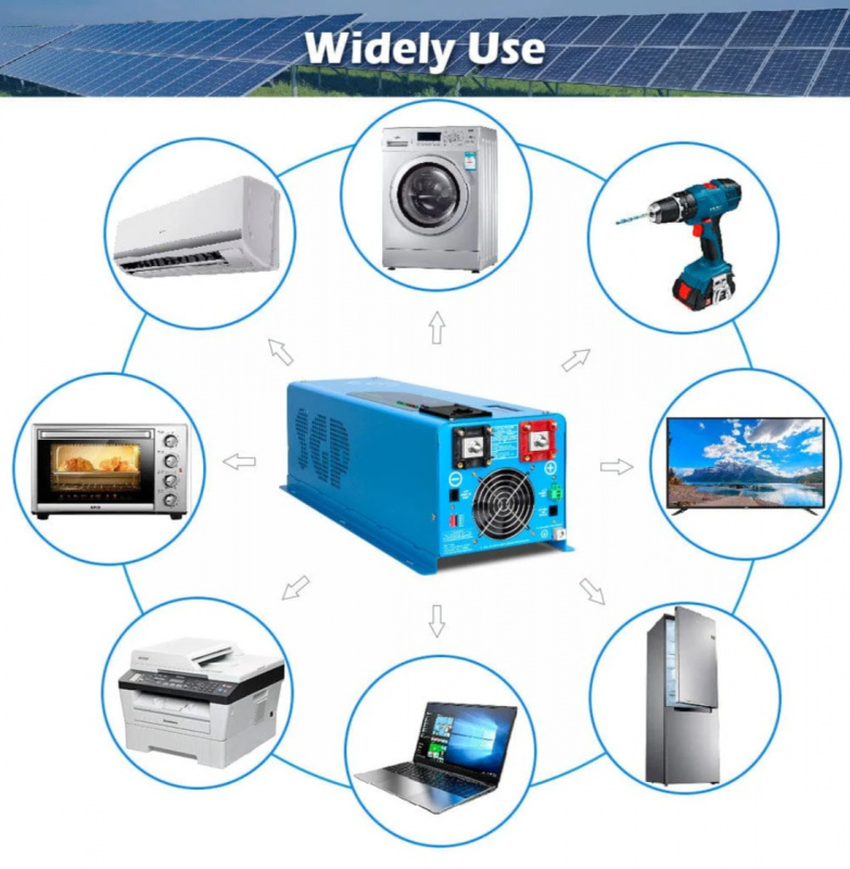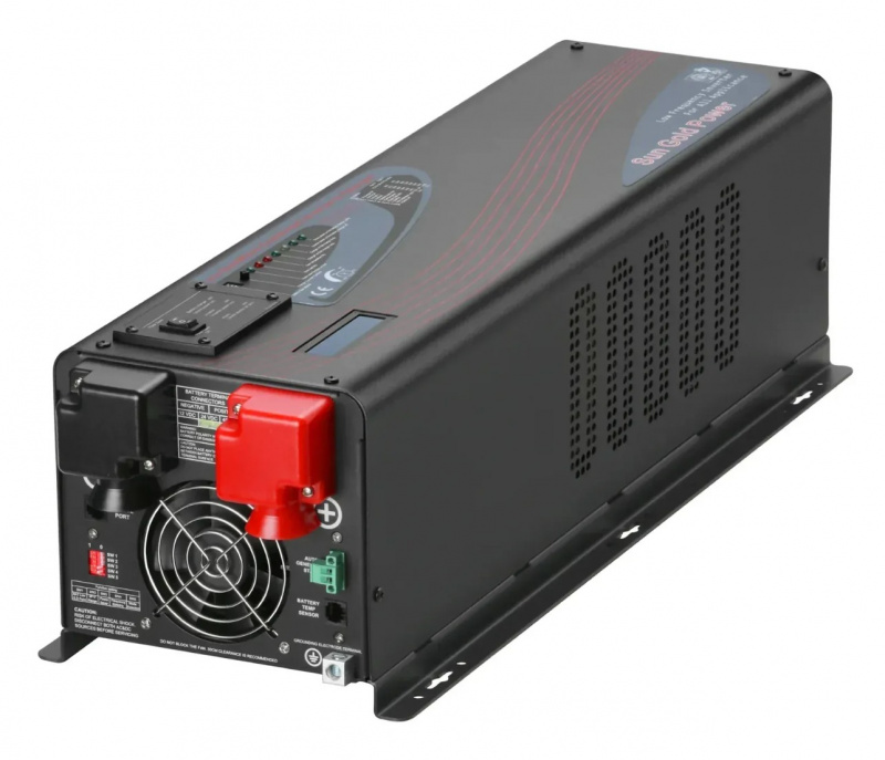 Key Features • 6000W Continuous / 18000W Peak Output – Pure sine wave for clean, stable power suitable for sensitive electronics and high-surge loads. • True Split-Phase 120V/240V – Supports dual-voltage output for full-home or large RV/appliance power. • UL1741 Certification – Meets strict safety and performance standards for grid-tie and backup applications. • Built-in Charger – Efficient AC-to-DC charging for 48V battery banks (lithium, AGM, gel, flooded compatible). • 48V DC Input – Works with 48V lithium (LiFePO4) or lead-acid battery systems. • Multiple Protections – Overload, over-temperature, short-circuit, low-voltage, high-voltage, and reverse polarity safeguards. • Remote Control & Display – LCD screen and optional remote panel for monitoring and control. • Quiet & Efficient – Intelligent cooling fans, low idle consumption, and high efficiency (>90%). • Rugged Design – Durable aluminum housing for indoor/outdoor use with vibration resistance.